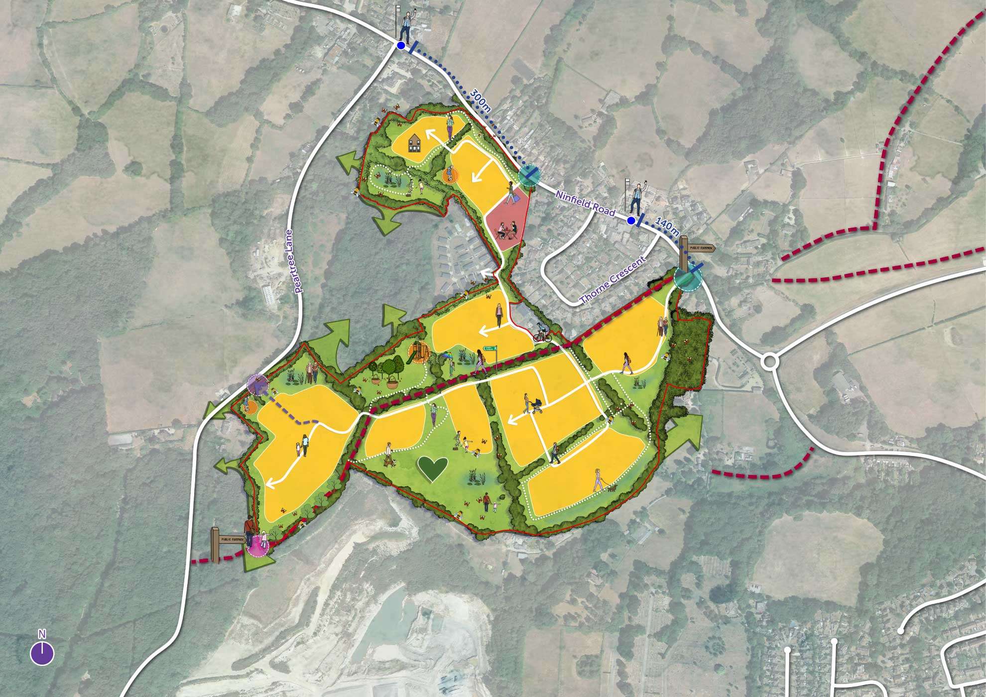 - Retention and enhancement of existing Public Rights of Way, alongside new and improved walking and recreational routes to strengthen local connectivity.